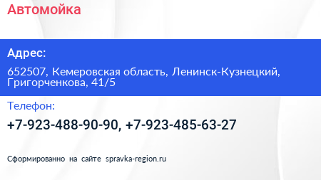 Автомойка по адресу 652507, Кемеровская область, Ленинск-Кузнецкий, Григорченкова, 41/5 в дальнейшем Организация, размещена в следующих категориях: