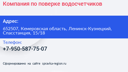 Компания по поверке водосчетчиков по адресу 652507, Кемеровская область, Ленинск-Кузнецкий, Спасстанция, 15/18 в дальнейшем Организация, размещена в следующих категориях: