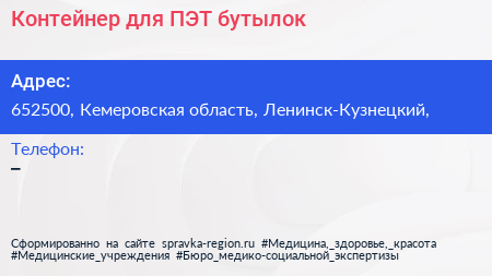 Контейнер для ПЭТ бутылок по адресу 652500, Кемеровская область, Ленинск-Кузнецкий, в дальнейшем Организация, размещена в следующих категориях: