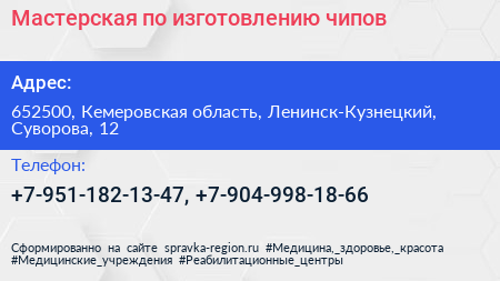 Мастерская по изготовлению чипов по адресу 652500, Кемеровская область, Ленинск-Кузнецкий, Суворова, 12 в дальнейшем Организация, размещена в следующих категориях: