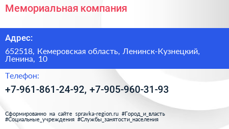 Мемориальная компания по адресу 652518, Кемеровская область, Ленинск-Кузнецкий, Ленина, 10 в дальнейшем Организация, размещена в следующих категориях: