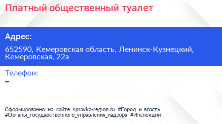 Платный общественный туалет по адресу 652590, Кемеровская область, Ленинск-Кузнецкий, Кемеровская, 22а в дальнейшем Организация, размещена в следующих категориях: