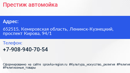 Престиж, автомойка по адресу 652515, Кемеровская область, Ленинск-Кузнецкий, проспект Кирова, 94/1 в дальнейшем Организация, размещена в следующих категориях: