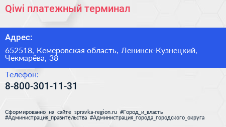 Qiwi, платежный терминал по адресу 652518, Кемеровская область, Ленинск-Кузнецкий, Чекмарёва, 38 в дальнейшем Организация, размещена в следующих категориях: