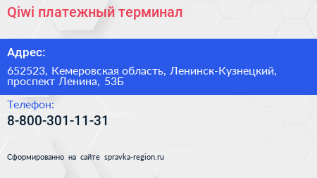 Qiwi, платежный терминал по адресу 652523, Кемеровская область, Ленинск-Кузнецкий, проспект Ленина, 53Б в дальнейшем Организация, размещена в следующих категориях: