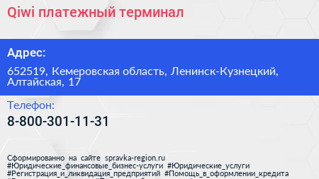 Qiwi, платежный терминал по адресу 652519, Кемеровская область, Ленинск-Кузнецкий, Алтайская, 17 в дальнейшем Организация, размещена в следующих категориях: