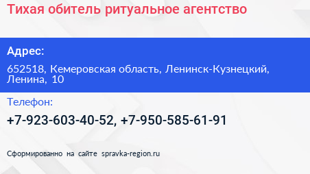 Тихая обитель, ритуальное агентство по адресу 652518, Кемеровская область, Ленинск-Кузнецкий, Ленина, 10 в дальнейшем Организация, размещена в следующих категориях: