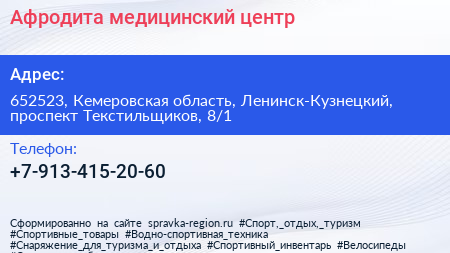 Афродита, медицинский центр по адресу 652523, Кемеровская область, Ленинск-Кузнецкий, проспект Текстильщиков, 8/1 в дальнейшем Организация, размещена в следующих категориях: