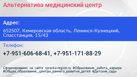 Альтернатива, медицинский центр по адресу 652507, Кемеровская область, Ленинск-Кузнецкий, Спасстанция, 15/43 в дальнейшем Организация, размещена в следующих категориях: