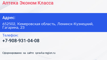 Аптека Эконом Класса по адресу 652502, Кемеровская область, Ленинск-Кузнецкий, Гагарина, 23 в дальнейшем Организация, размещена в следующих категориях: