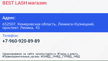 BEST-LASH, магазин по адресу 652507, Кемеровская область, Ленинск-Кузнецкий, проспект Ленина, 41 в дальнейшем Организация, размещена в следующих категориях: