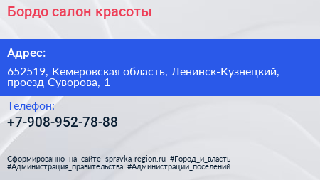 Бордо, салон красоты по адресу 652519, Кемеровская область, Ленинск-Кузнецкий, проезд Суворова, 1 в дальнейшем Организация, размещена в следующих категориях: