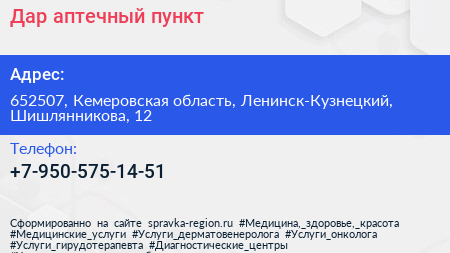 Дар, аптечный пункт по адресу 652507, Кемеровская область, Ленинск-Кузнецкий, Шишлянникова, 12 в дальнейшем Организация, размещена в следующих категориях: