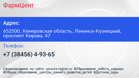 ФармЦент по адресу 652500, Кемеровская область, Ленинск-Кузнецкий, проспект Кирова, 47 в дальнейшем Организация, размещена в следующих категориях: