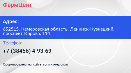 ФармЦент по адресу 652515, Кемеровская область, Ленинск-Кузнецкий, проспект Кирова, 114 в дальнейшем Организация, размещена в следующих категориях: