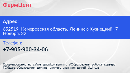 ФармЦент по адресу 652519, Кемеровская область, Ленинск-Кузнецкий, 7 Ноября, 32 в дальнейшем Организация, размещена в следующих категориях: