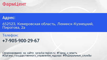 ФармЦент по адресу 652523, Кемеровская область, Ленинск-Кузнецкий, Пирогова, 2а в дальнейшем Организация, размещена в следующих категориях: