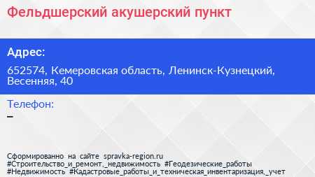 Фельдшерский-акушерский пункт по адресу 652574, Кемеровская область, Ленинск-Кузнецкий, Весенняя, 40 в дальнейшем Организация, размещена в следующих категориях: