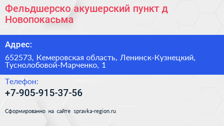 Фельдшерско-акушерский пункт, д. Новопокасьма по адресу 652573, Кемеровская область, Ленинск-Кузнецкий, Туснолобовой-Марченко, 1 в дальнейшем Организация, размещена в следующих категориях: