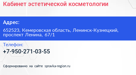 Кабинет эстетической косметологии по адресу 652523, Кемеровская область, Ленинск-Кузнецкий, проспект Ленина, 67/1 в дальнейшем Организация, размещена в следующих категориях: