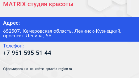 MATRIX, студия красоты по адресу 652507, Кемеровская область, Ленинск-Кузнецкий, проспект Ленина, 56 в дальнейшем Организация, размещена в следующих категориях: