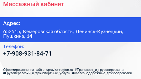 Массажный кабинет по адресу 652515, Кемеровская область, Ленинск-Кузнецкий, Пушкина, 14 в дальнейшем Организация, размещена в следующих категориях: