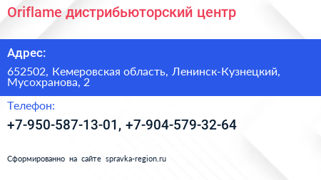 Oriflame, дистрибьюторский центр по адресу 652502, Кемеровская область, Ленинск-Кузнецкий, Мусохранова, 2 в дальнейшем Организация, размещена в следующих категориях: