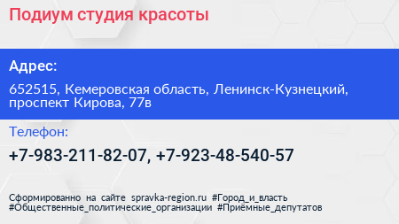 Подиум, студия красоты по адресу 652515, Кемеровская область, Ленинск-Кузнецкий, проспект Кирова, 77в в дальнейшем Организация, размещена в следующих категориях: