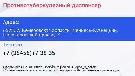 Противотуберкулезный диспансер по адресу 652507, Кемеровская область, Ленинск-Кузнецкий, Новокировский проезд, 7 в дальнейшем Организация, размещена в следующих категориях: