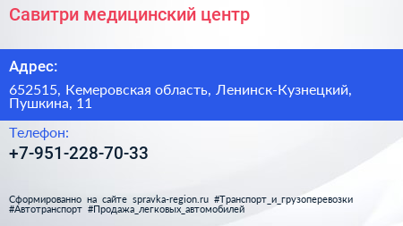 Савитри, медицинский центр по адресу 652515, Кемеровская область, Ленинск-Кузнецкий, Пушкина, 11 в дальнейшем Организация, размещена в следующих категориях: