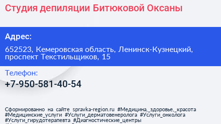 Студия депиляции Битюковой Оксаны по адресу 652523, Кемеровская область, Ленинск-Кузнецкий, проспект Текстильщиков, 15 в дальнейшем Организация, размещена в следующих категориях: