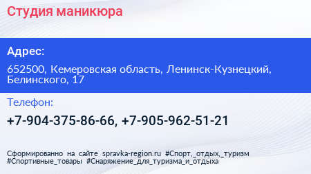 Студия маникюра по адресу 652500, Кемеровская область, Ленинск-Кузнецкий, Белинского, 17 в дальнейшем Организация, размещена в следующих категориях: