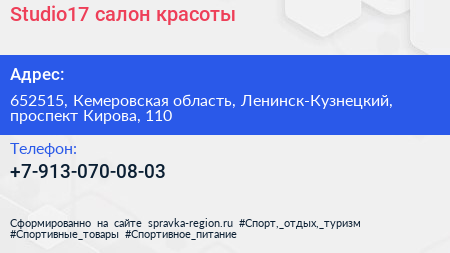 Studio17, салон красоты по адресу 652515, Кемеровская область, Ленинск-Кузнецкий, проспект Кирова, 110 в дальнейшем Организация, размещена в следующих категориях: