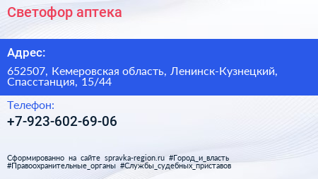 Светофор, аптека по адресу 652507, Кемеровская область, Ленинск-Кузнецкий, Спасстанция, 15/44 в дальнейшем Организация, размещена в следующих категориях:
