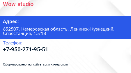 Wow studio по адресу 652507, Кемеровская область, Ленинск-Кузнецкий, Спасстанция, 15/18 в дальнейшем Организация, размещена в следующих категориях: