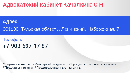 Адвокатский кабинет Качалкина С.Н. по адресу 301130, Тульская область, Ленинский, Набережная, 7 в дальнейшем Организация, размещена в следующих категориях: