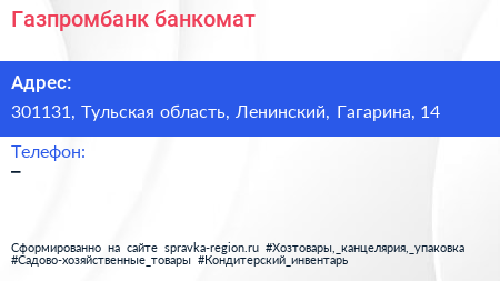 Газпромбанк, банкомат по адресу 301131, Тульская область, Ленинский, Гагарина, 14 в дальнейшем Организация, размещена в следующих категориях: