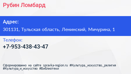 Рубин-Ломбард по адресу 301131, Тульская область, Ленинский, Мичурина, 1 в дальнейшем Организация, размещена в следующих категориях: