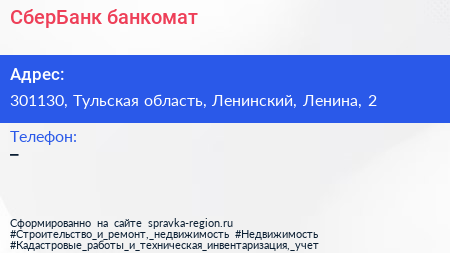 СберБанк, банкомат по адресу 301130, Тульская область, Ленинский, Ленина, 2 в дальнейшем Организация, размещена в следующих категориях: