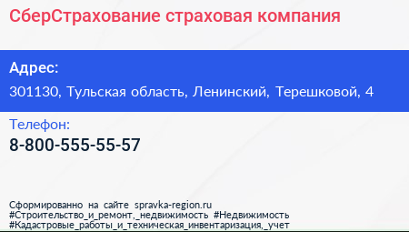 СберСтрахование, страховая компания по адресу 301130, Тульская область, Ленинский, Терешковой, 4 в дальнейшем Организация, размещена в следующих категориях: