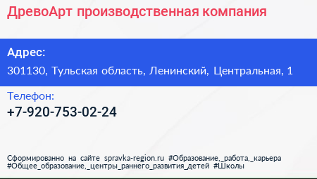 ДревоАрт, производственная компания по адресу 301130, Тульская область, Ленинский, Центральная, 1 в дальнейшем Организация, размещена в следующих категориях:
