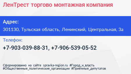 ЛенТрест, торгово-монтажная компания по адресу 301130, Тульская область, Ленинский, Центральная, 3а в дальнейшем Организация, размещена в следующих категориях: