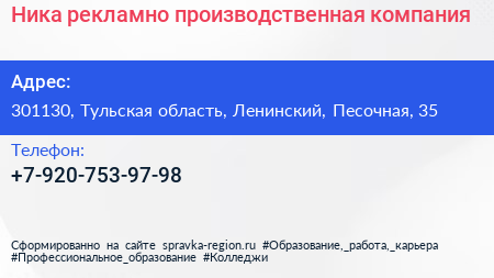 Ника, рекламно-производственная компания по адресу 301130, Тульская область, Ленинский, Песочная, 35 в дальнейшем Организация, размещена в следующих категориях: