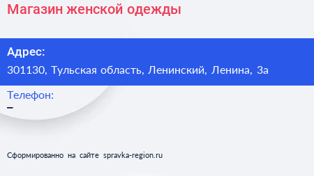 Магазин женской одежды по адресу 301130, Тульская область, Ленинский, Ленина, 3а в дальнейшем Организация, размещена в следующих категориях: