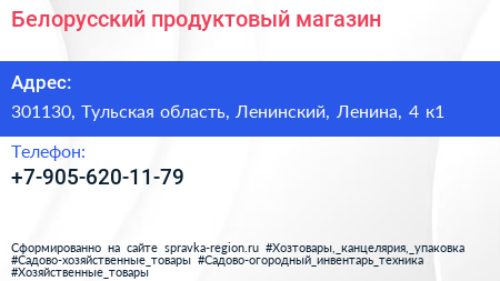 Белорусский, продуктовый магазин по адресу 301130, Тульская область, Ленинский, Ленина, 4 к1 в дальнейшем Организация, размещена в следующих категориях: