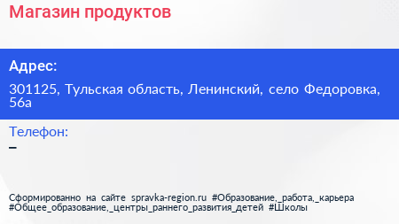 Магазин продуктов по адресу 301125, Тульская область, Ленинский, село Федоровка, 56а в дальнейшем Организация, размещена в следующих категориях: