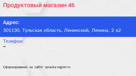 Продуктовый магазин №46 по адресу 301130, Тульская область, Ленинский, Ленина, 2 к2 в дальнейшем Организация, размещена в следующих категориях: