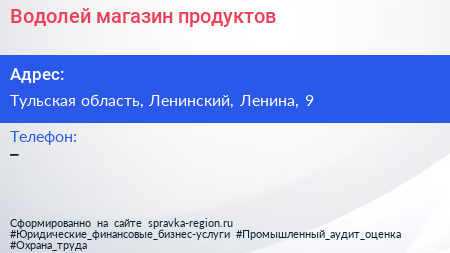 Водолей, магазин продуктов по адресу Тульская область, Ленинский, Ленина, 9 в дальнейшем Организация, размещена в следующих категориях: