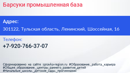 Барсуки, промышленная база по адресу 301122, Тульская область, Ленинский, Шоссейная, 16 в дальнейшем Организация, размещена в следующих категориях: