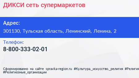 ДИКСИ, сеть супермаркетов по адресу 301130, Тульская область, Ленинский, Ленина, 2 в дальнейшем Организация, размещена в следующих категориях: